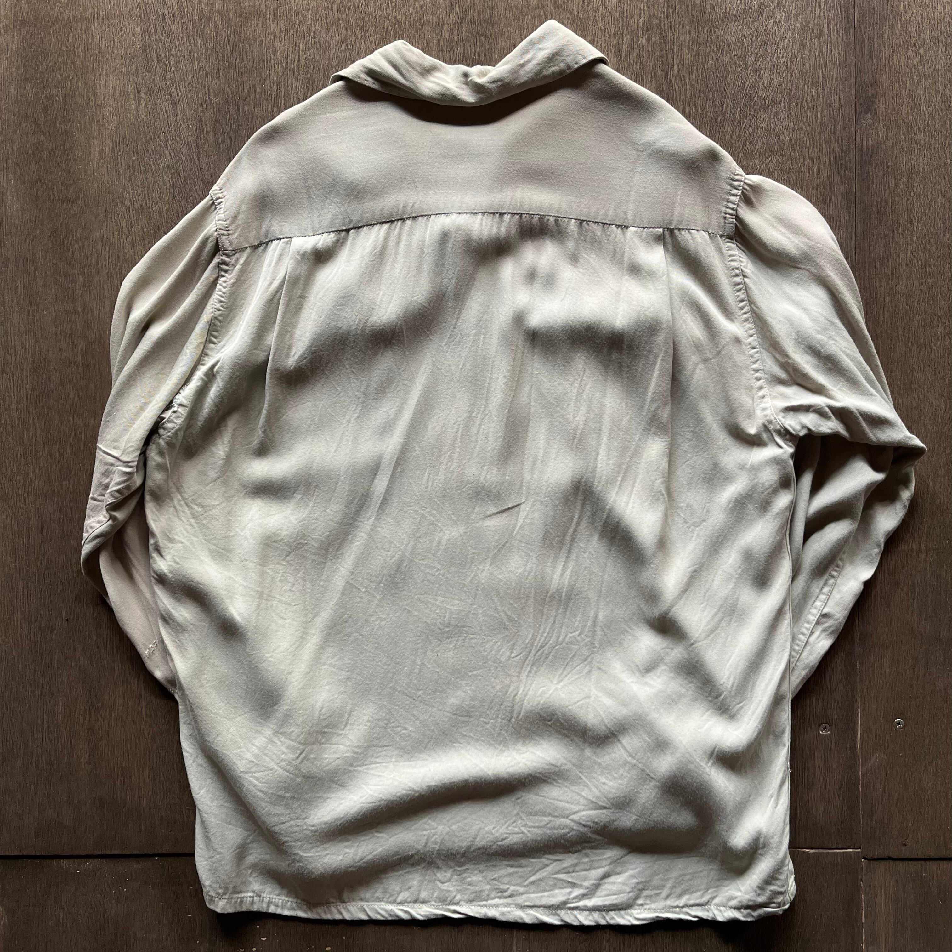 襟大きめ、フラップポケットと古めのレーヨンシャツ。